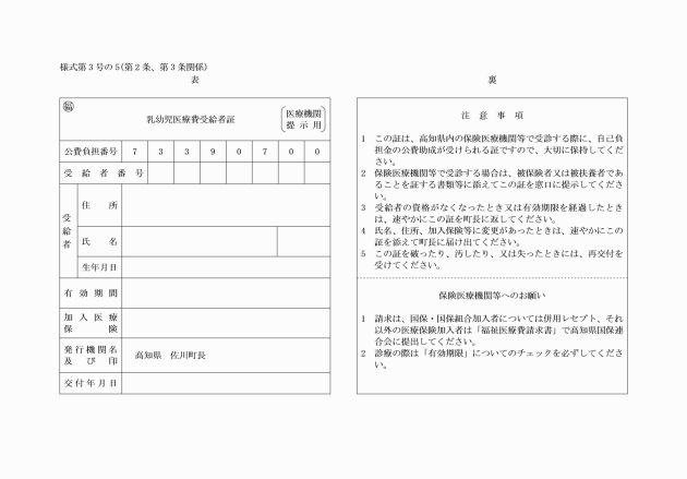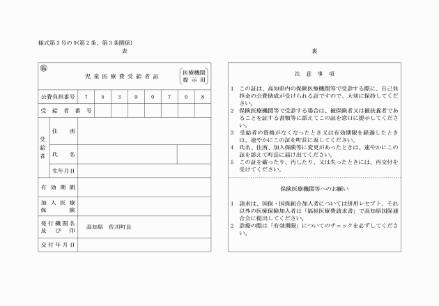4 町長は、前2項の規定により資格認定を受けた者(以下「受給権者」という。)のうち75歳未満の者で、65歳未満において受給権者となったもの及び平成15年9月30日までに受給権者となったもので、後期高齢者医療以外の医療保険に加入しているものに対しては障害医療費受給者証(様式第3号)を、65歳以上75歳未満の者のうち、平成15年10月1日以降に65歳以上において受給権者となったもので後期高齢者医療以外の医療保険に加入しているものに対しては障害医療費受給者証(様式第3号の2)を、65歳以上のもののうち、65歳未満において受給権者となったもの及び平成15年9月30日までに受給権者となったもので、後期高齢者医療の被保険者である者に対しては高齢障害医療費受給者証(様式第3号の3)を、65歳以上のもので、後期高齢者医療の被保険者であるものに対しては高齢障害医療費受給者証(様式第3号の4)を、受給者が乳児の受給権者又は受給者が幼児で受給権者が非課税世帯のものに対しては乳幼児医療費受給者証(様式第3号の5)を、受給者が第1子又は第2子の幼児で受給権者の所得が児童手当所得制限限度額を超えないものに対しては乳幼児医療費受給者証(様式第3号の6)を、受給者が第3子以降の幼児で受給権者の所得が児童手当所得制限限度額を超えないものに対しては乳幼児医療費受給者証(様式第3号の7)を、受給者が幼児で受給権者の所得が児童手当所得制限限度額を超えるものに対しては乳幼児医療費受給者証(様式第3号の8)を、受給者が児童の受給権者に対しては児童医療費受給者証(様式第3号の9)を、それぞれ必要な事項を記載して交付するとともに次の取扱いをするものとする。