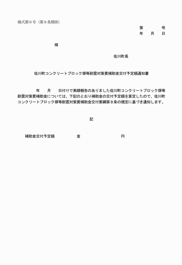 第9条 補助事業者は、補助金の交付を受けようとするときは、交付予定額の通知を受けた後、速やかに佐川町コンクリートブロック塀等耐震対策費補助金交付申請書(様式第7号)により、町長に申請しなければならない。