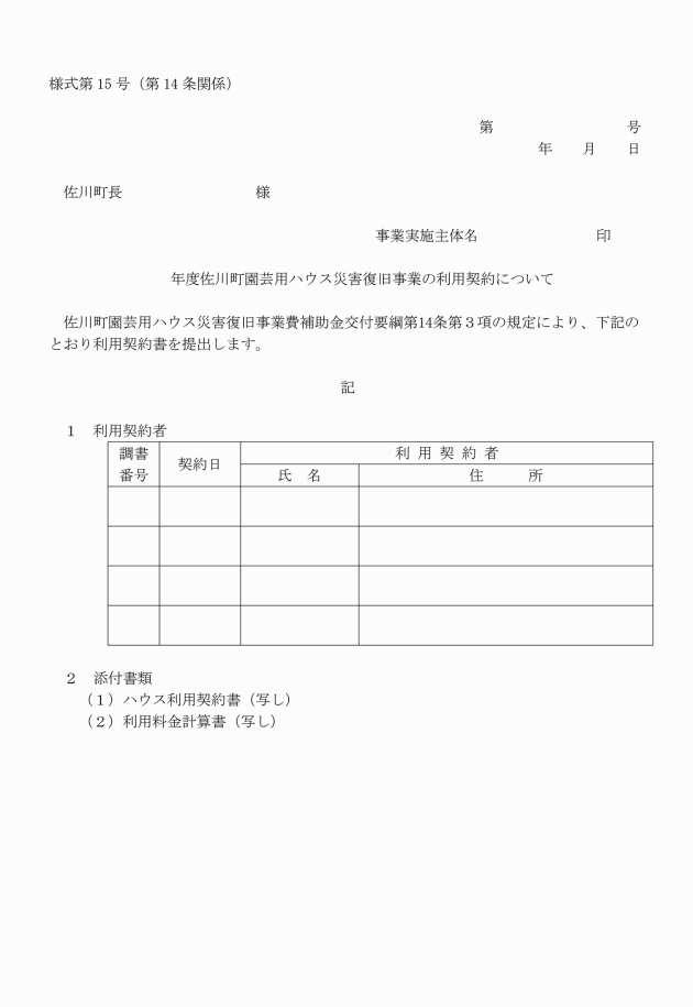 2 事業実施主体は、該事業により設置したハウス等を賃貸契約により農業者に利用させる場合は、その利用契約について、事業実施主体が契約を締結した日から起算して30日を経過した日又は翌年度の4月15日のいずれか早い日までに佐川町園芸用ハウス災害復旧事業の利用契約について(様式第15号)を町長に提出しなければならない。