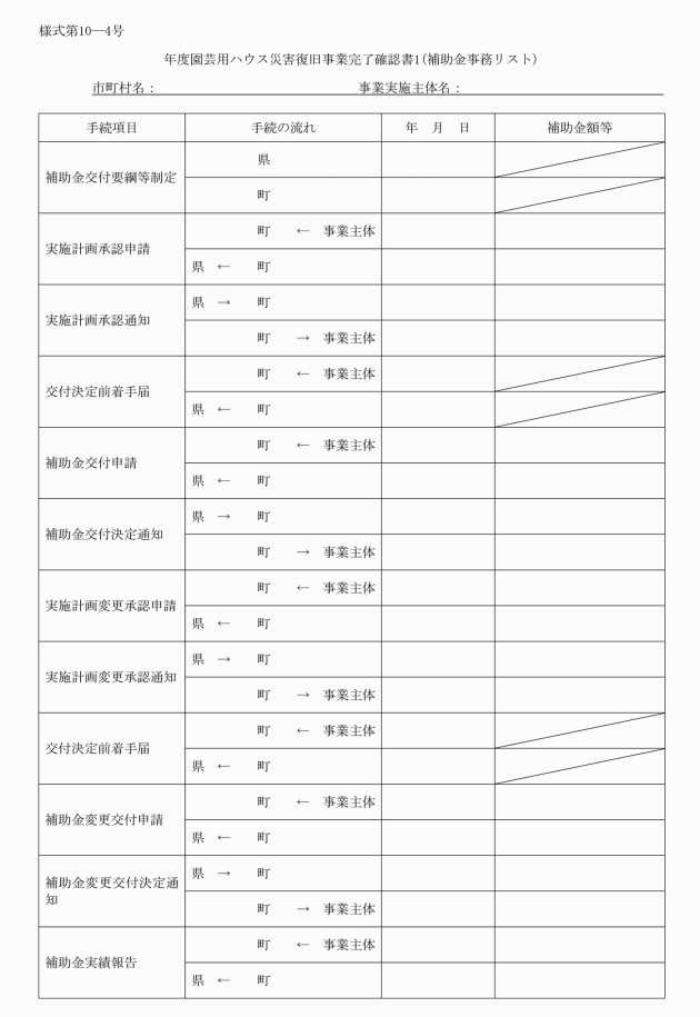 第10条 事業実施主体は、補助金の交付の決定を受けた補助事業について、交付決定額の増額又は20パーセント若しくは50万円を超える減額をしようとする場合は、佐川町園芸用ハウス災害復旧事業費補助金変更交付申請書(様式第9号)により速やかに町長に申請し、その決定を受けなければならない。