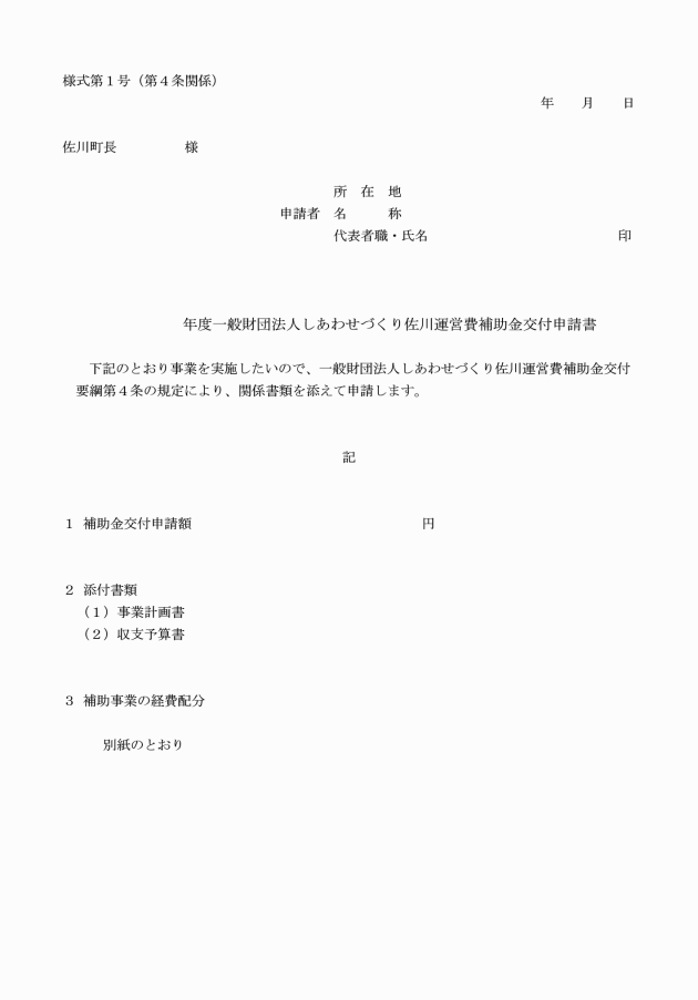 第4条 補助事業者は、補助金の交付を受けようとするときは、様式第1号による一般財団法人しあわせづくり佐川運営費補助金交付申請書に関係書類を添えて、町長に申請しなければならない。